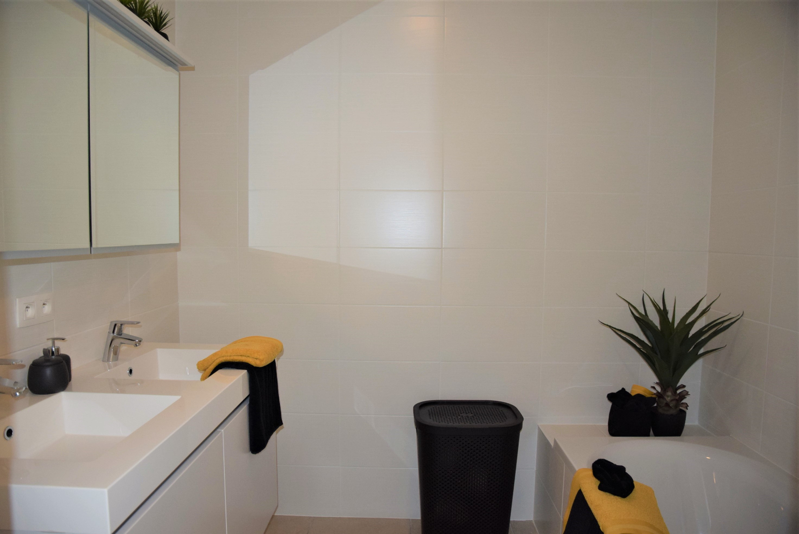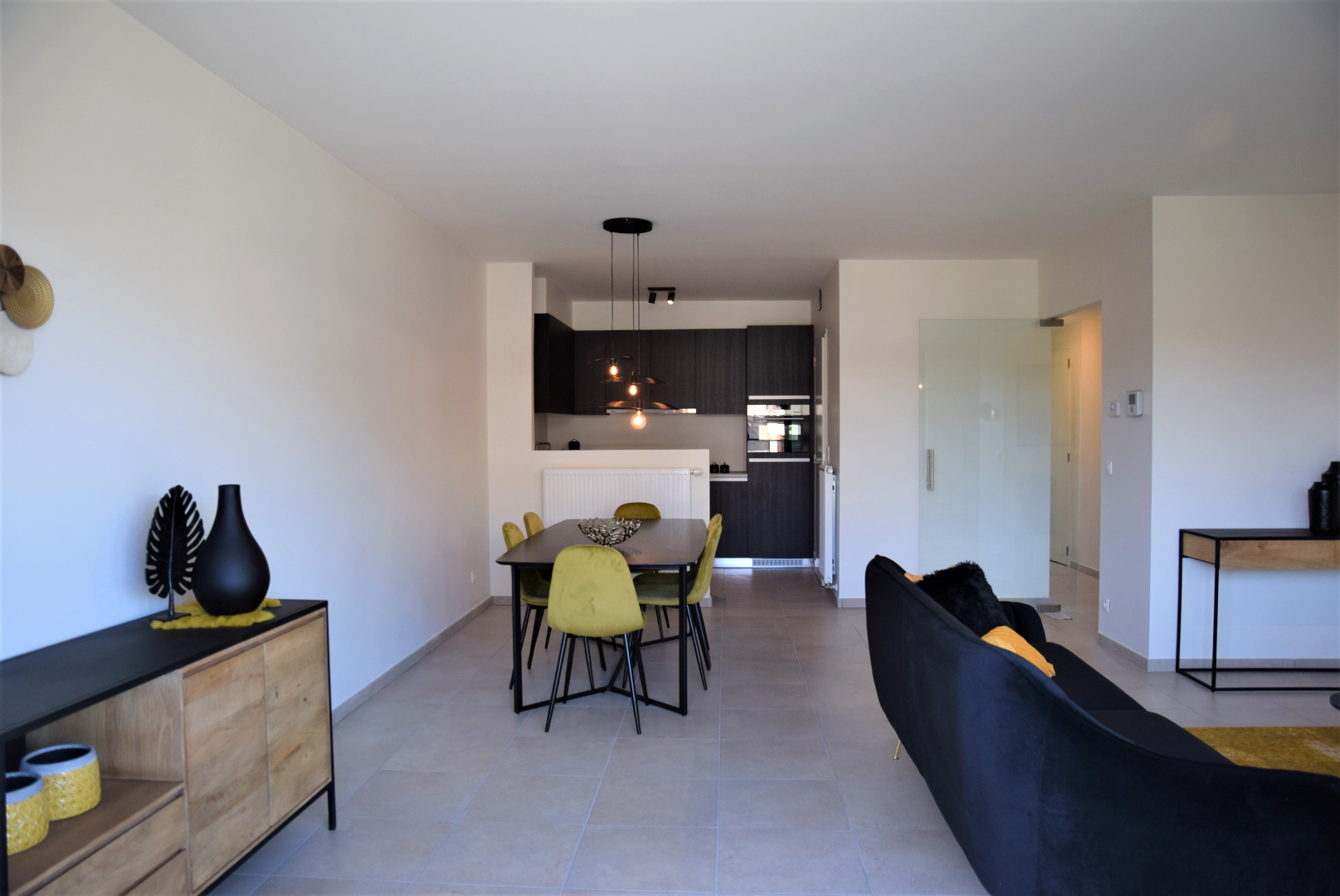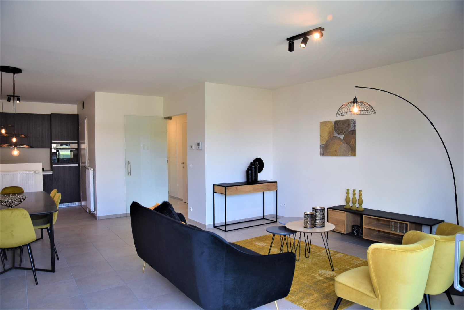 bestaande uit: inkomhal, vestiaire, apart toilet, grote woonkamer met open keuken en aangrenzend groot terras (24,45 m2), berging met wasmachine aansluiting, 2 ruime slaapkamers, luxueuze badkamer met ligbad en lavabo. Het complex is gebouwd onder moderne tijdloze architectuur en heeft verder aangelegde tuinen, grote gesloten garages, private kelders, uitzonderlijke thermische en akoestische isolatie, E peil tussen 45 en 65, luxueuze vloerbekleding, kwaliteitsvolle keuken en individuele verwarming op aardgas. AANVANG WERKEN MEI 2021!