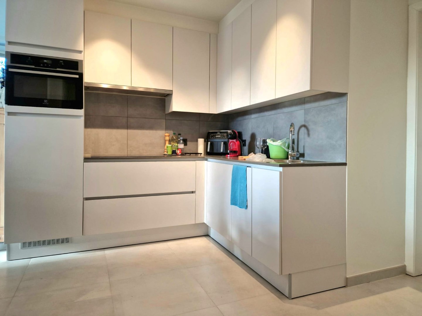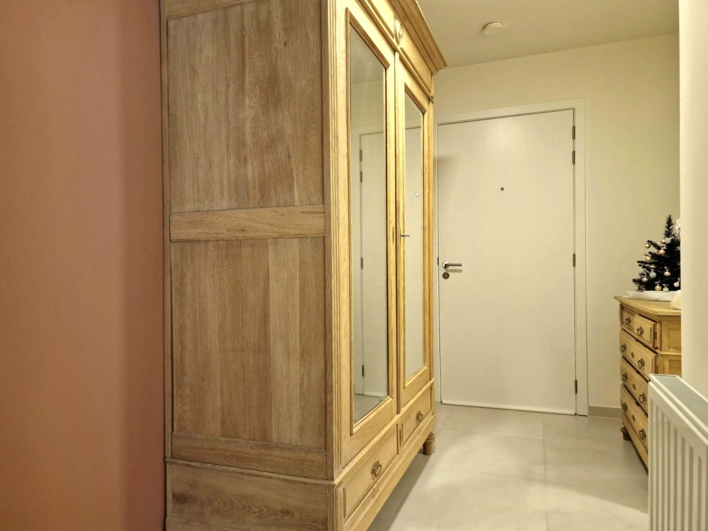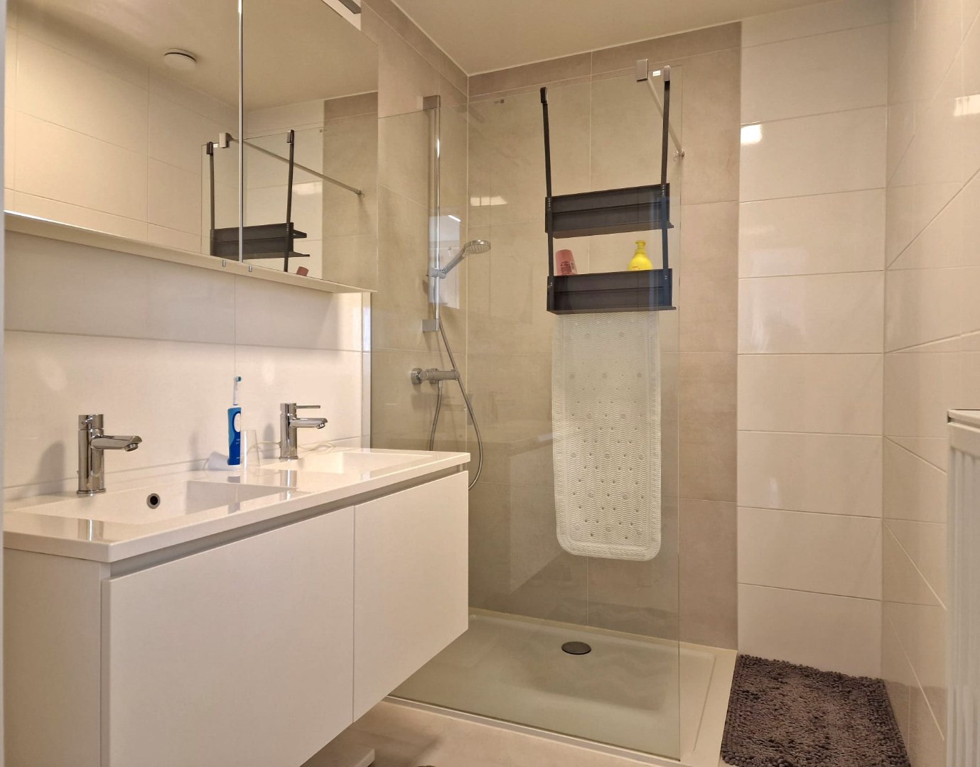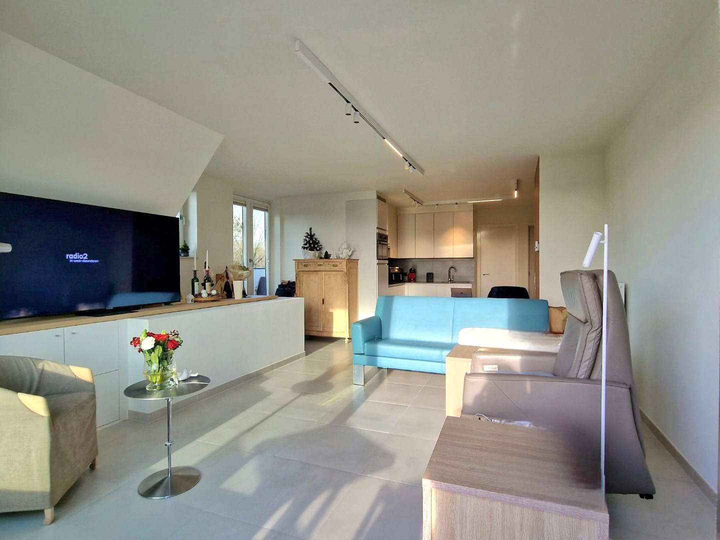 Bestaande uit : inkomhal, living met 2 zonneterrassen, open ingerichte keuken, 2 slaapkamers, badkamer met inloopdouche en dubbele lavabo, apart toilet met lavabo meubel en berging met aansluiting voor wasmachine en droogkast. Privatieve kelder inbegrepen. Mogelijkheid tot aankoop van een grote garagebox. Fietsenberging en vuilnislokaal. Meer informatie vindt u op onze eigen website, www.immocattaert.be, onder de rubrieken "kenmerken en documenten". Bezichtigingen enkel mogelijk op afspraak. Een aanrader.