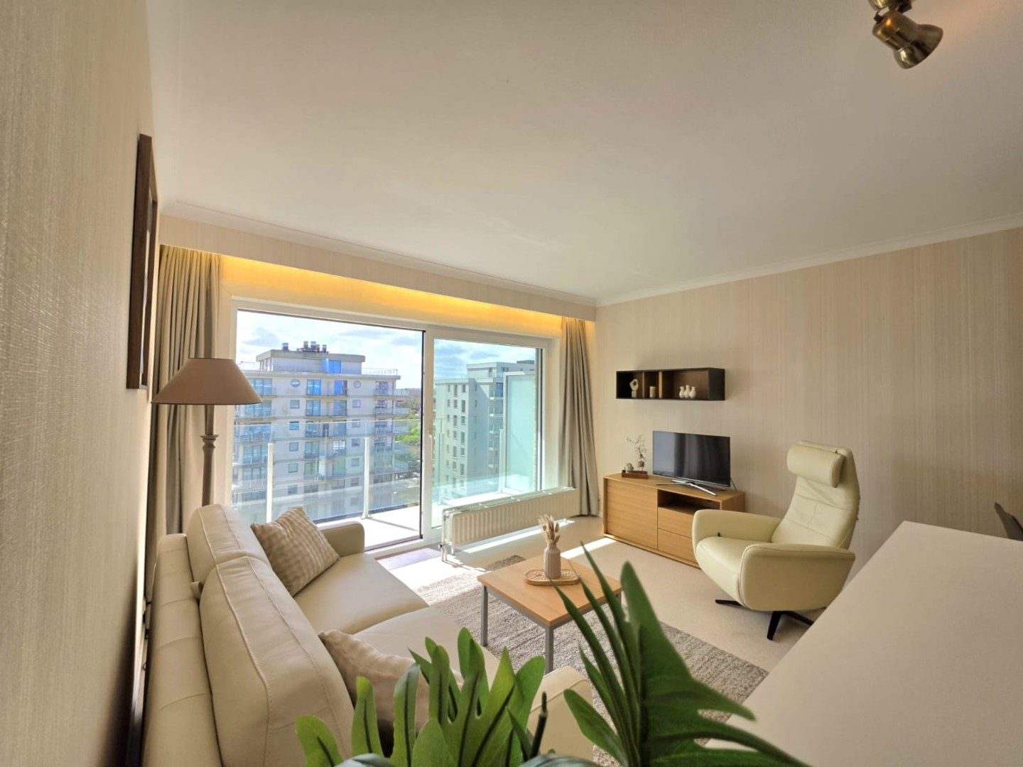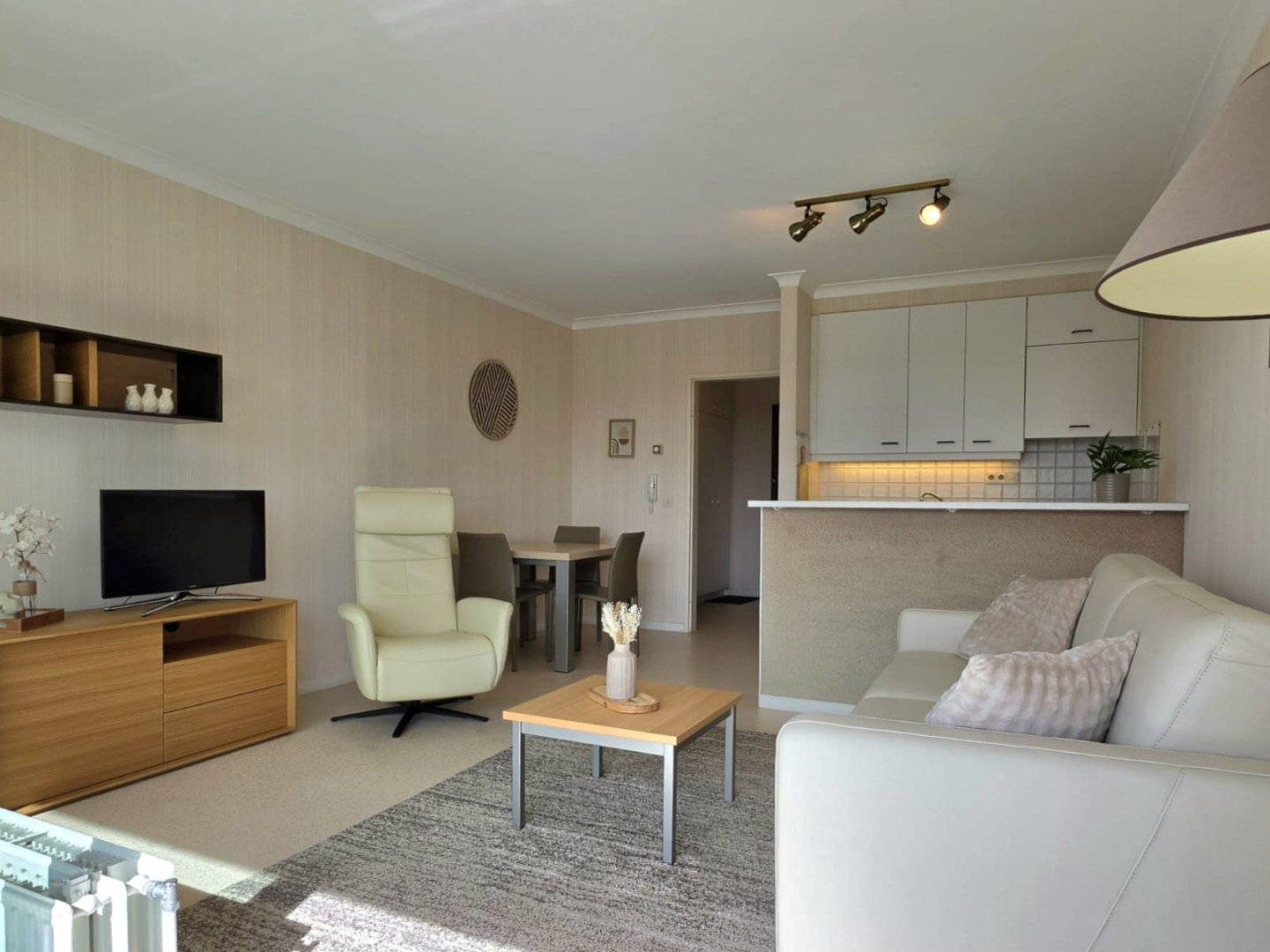Bestaande uit living met ruim zonneterras, open ingerichte keuken, slaaphoek (nu kastruimte), badkamer met bad, lavabo en toilet. 6de verdieping. Privatieve kelder inbegrepen. Wordt gemeubeld verkocht. Nieuwe ramen. Zeer gunstige EPC-score (LABEL A). De gevel en de balustrades werden compleet vernieuwd in 2022. Bezichtigingen zijn op afspraak. U vindt meer informatie op onze eigen website, www.immocattaert.be, onder de rubrieken "kenmerken & documenten".