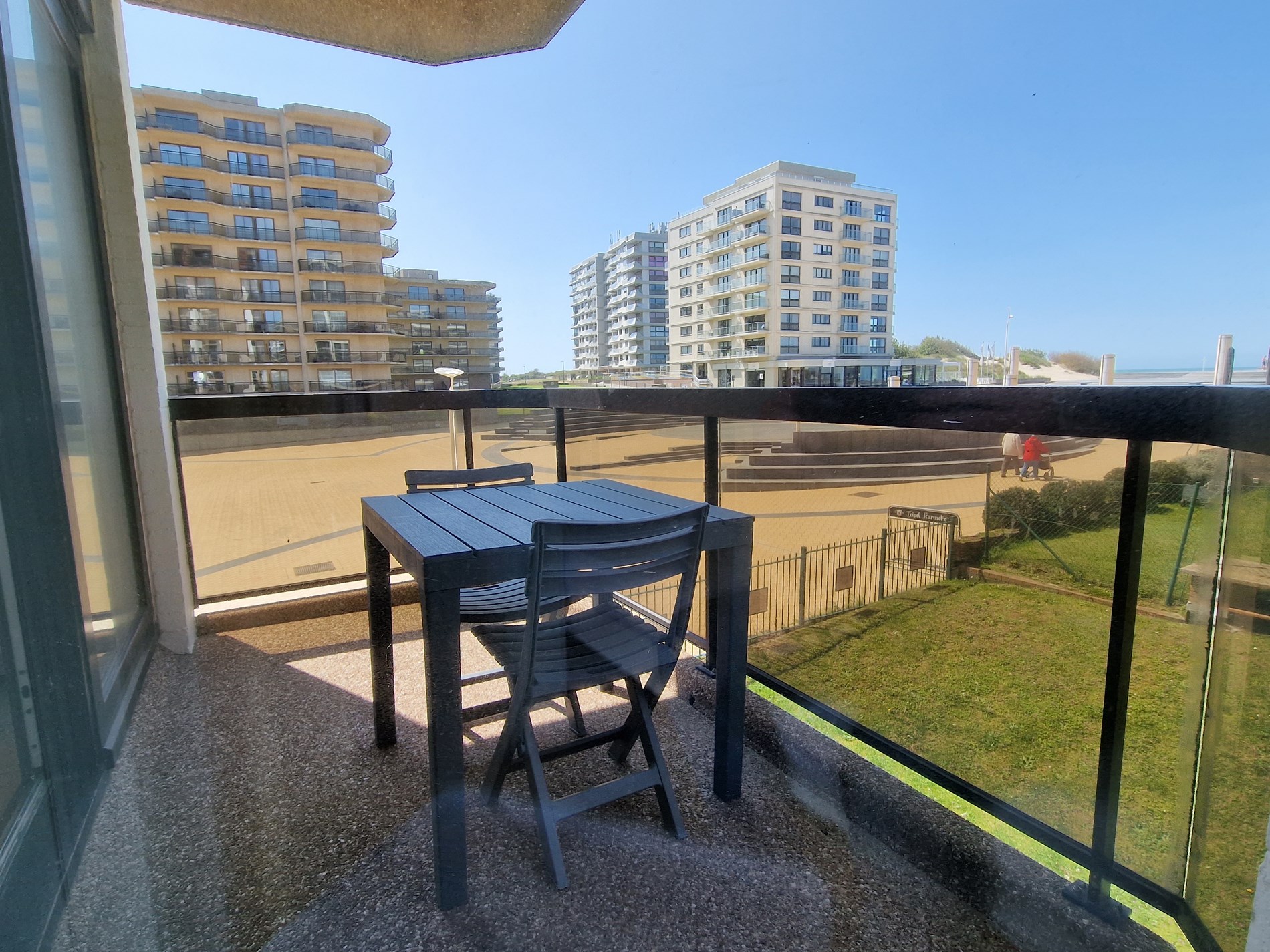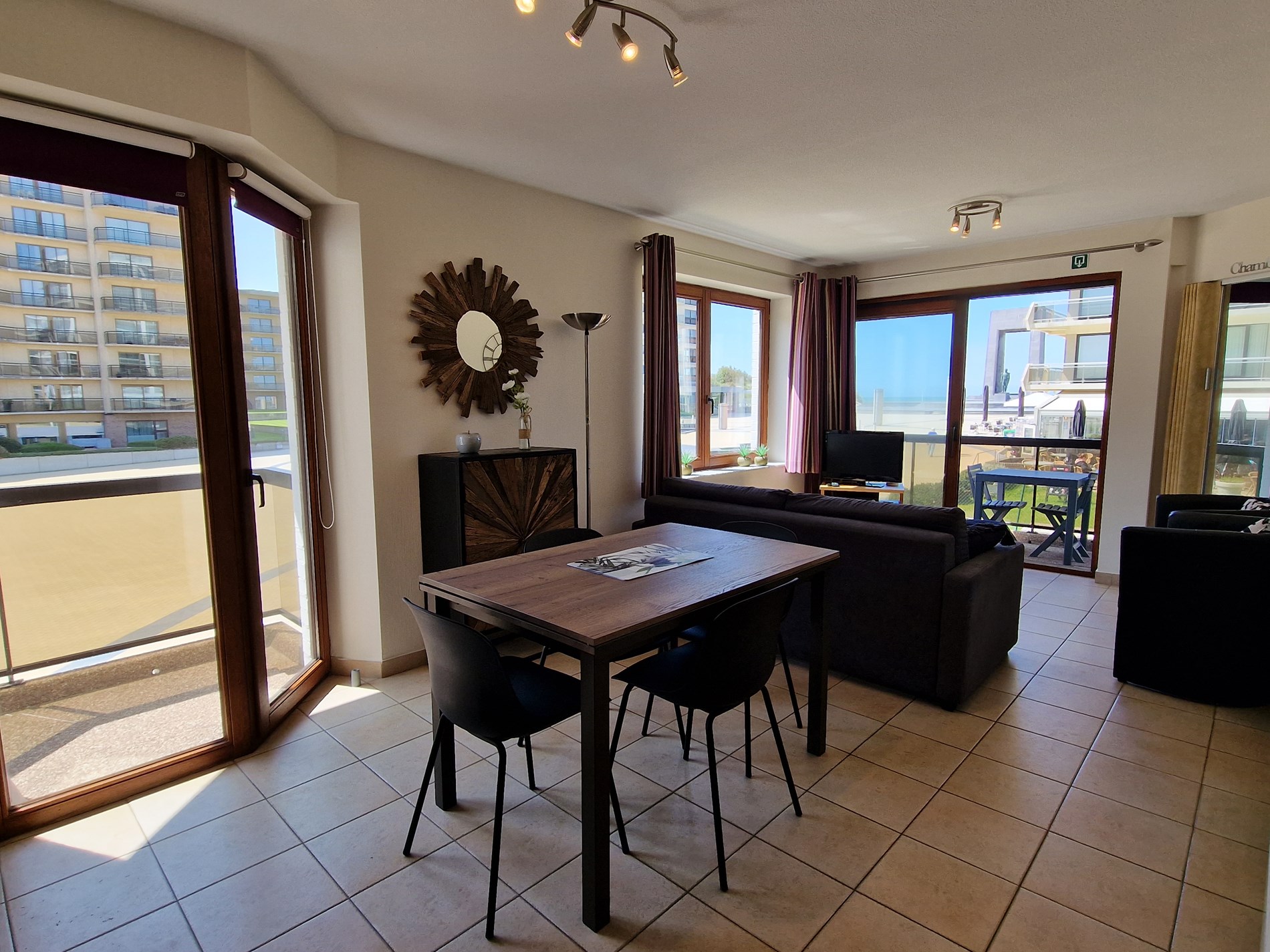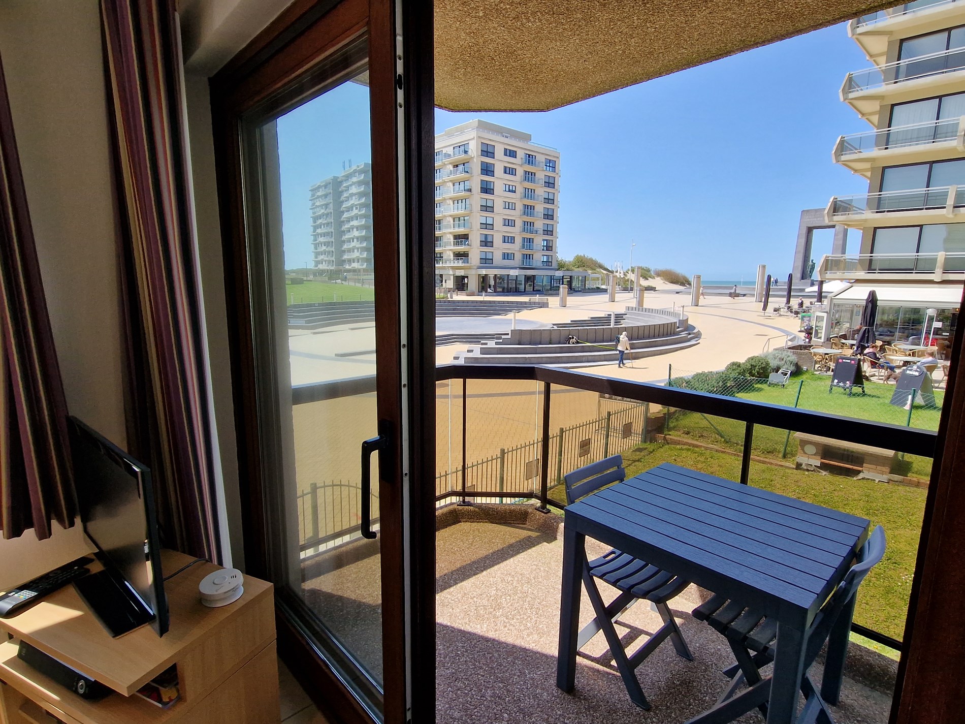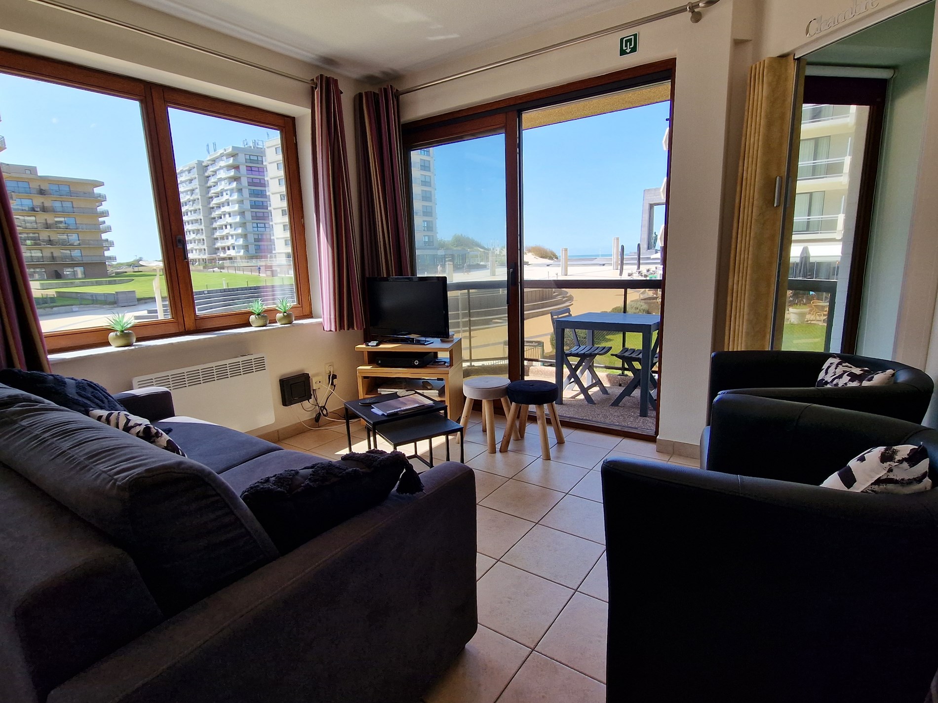 Modern zonnig hoekappartement op de 1ste verdieping met zeezicht en zicht op het Esplanadeplein, slaapkamer met tweepersoonsbed, slaaphoek met tweepersoonsbed, woonkamer met divanbed voor 2 personen. Uitstekende ligging !