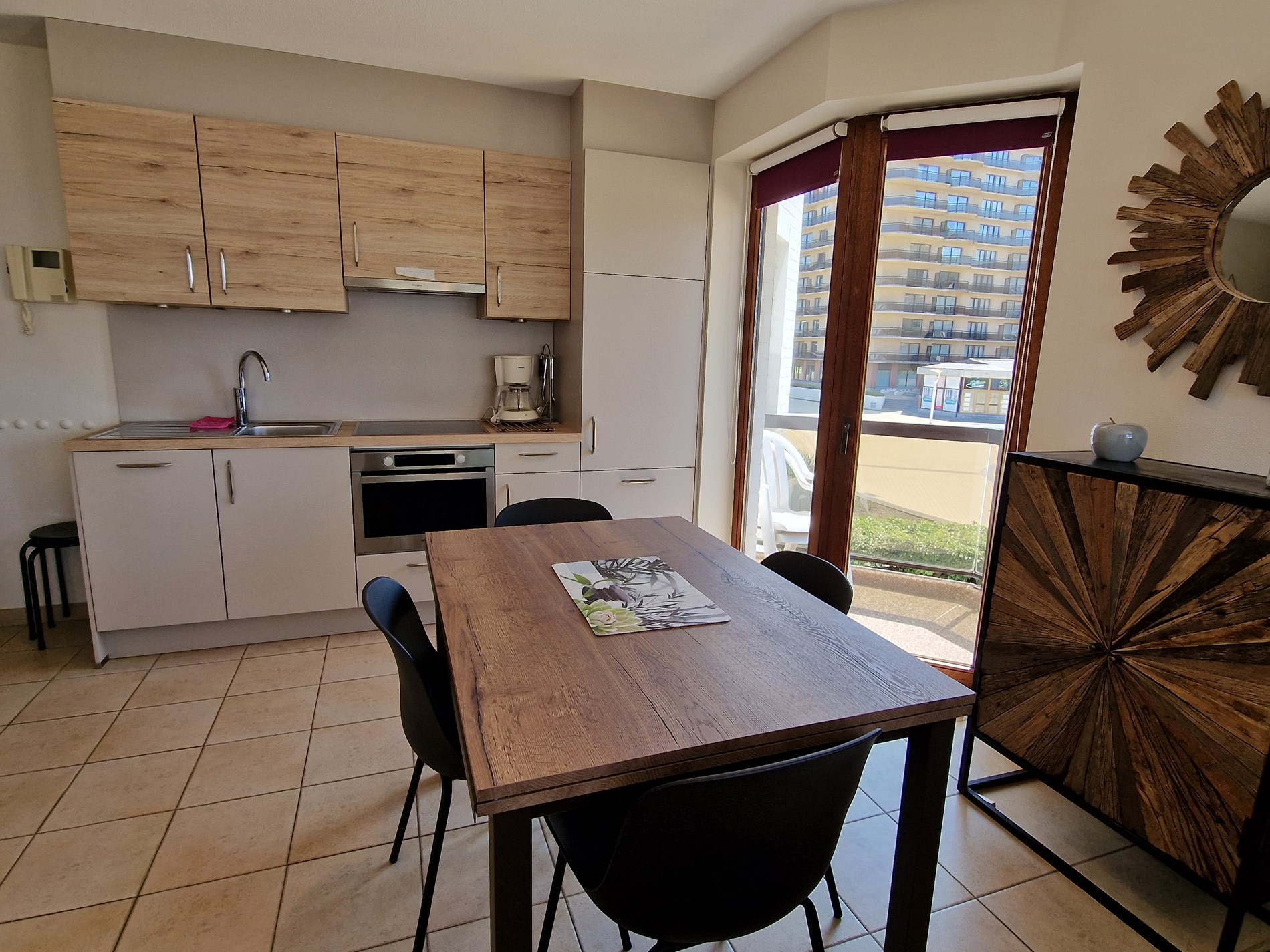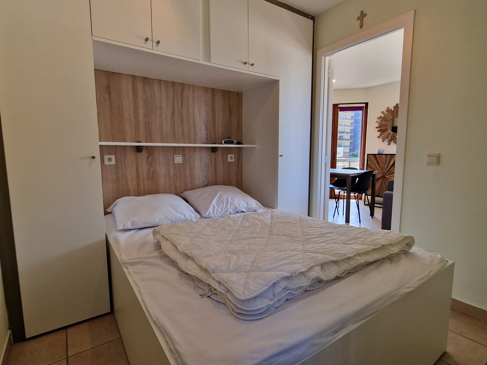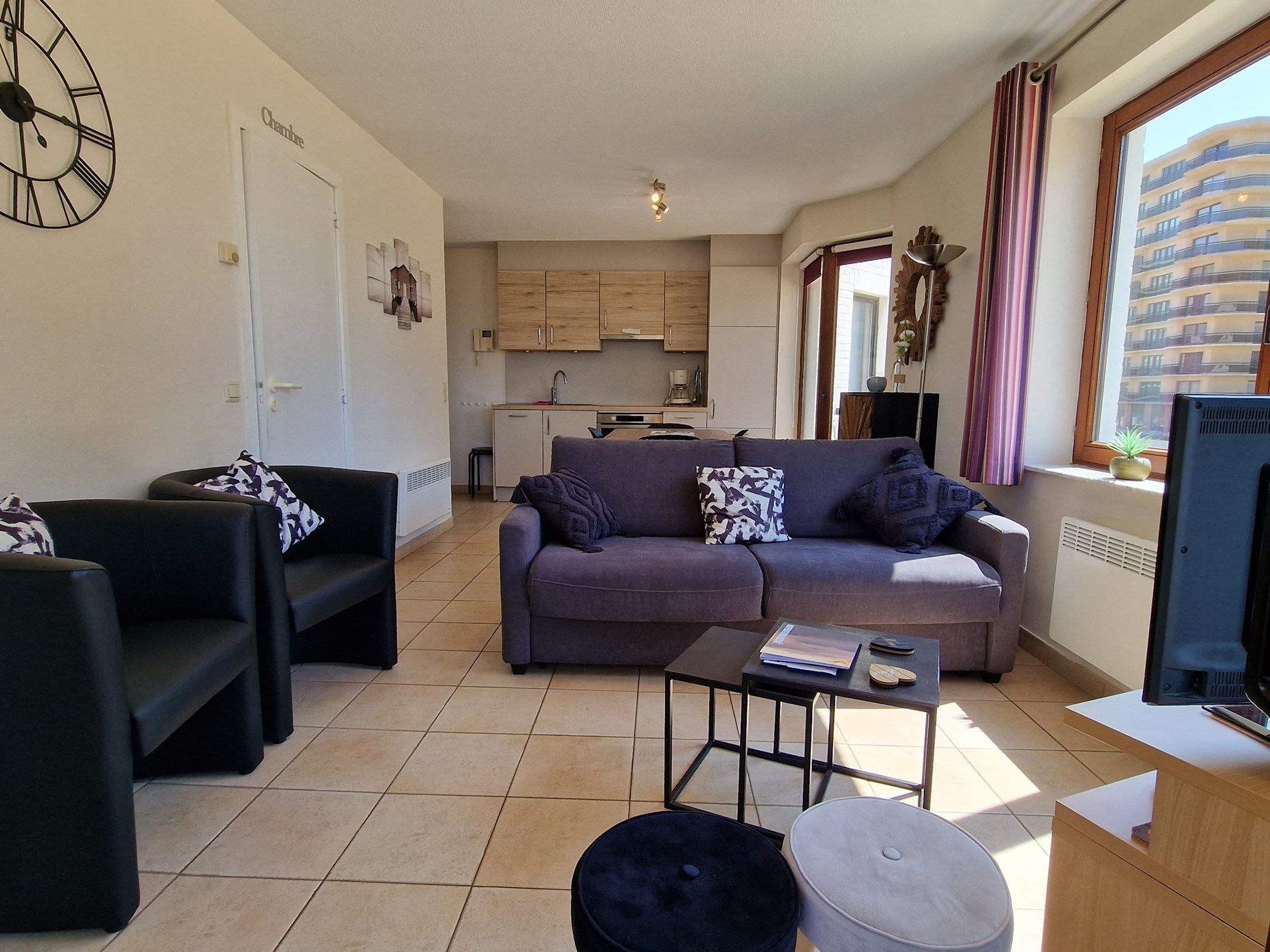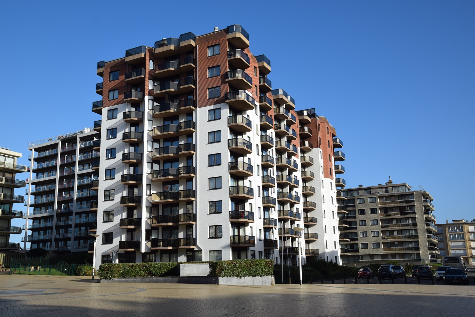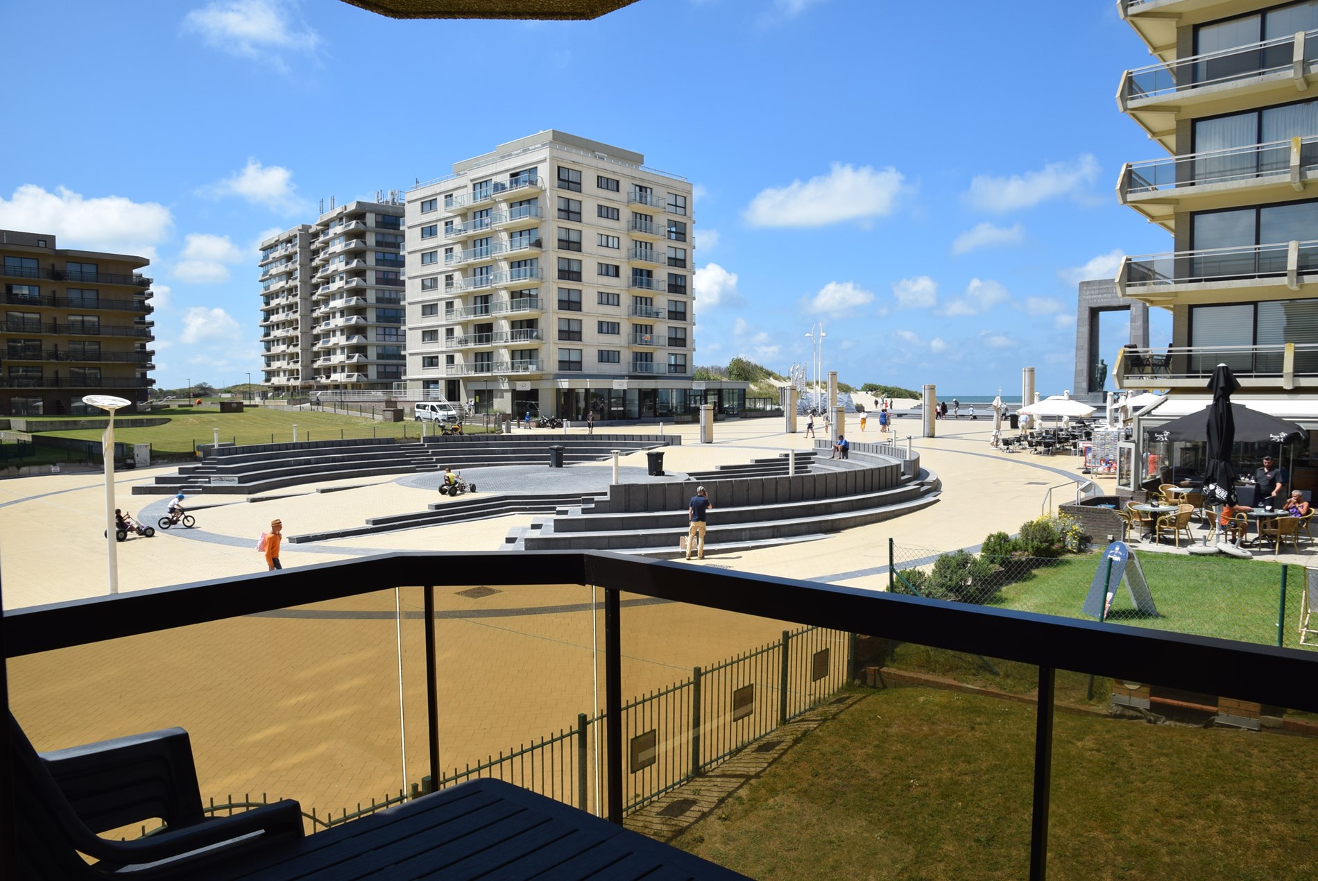 Modern zonnig hoekappartement op de 1ste verdieping met zeezicht en zicht op het Esplanadeplein, slaapkamer met tweepersoonsbed, slaaphoek met tweepersoonsbed, woonkamer met divanbed voor 2 personen. Uitstekende ligging !